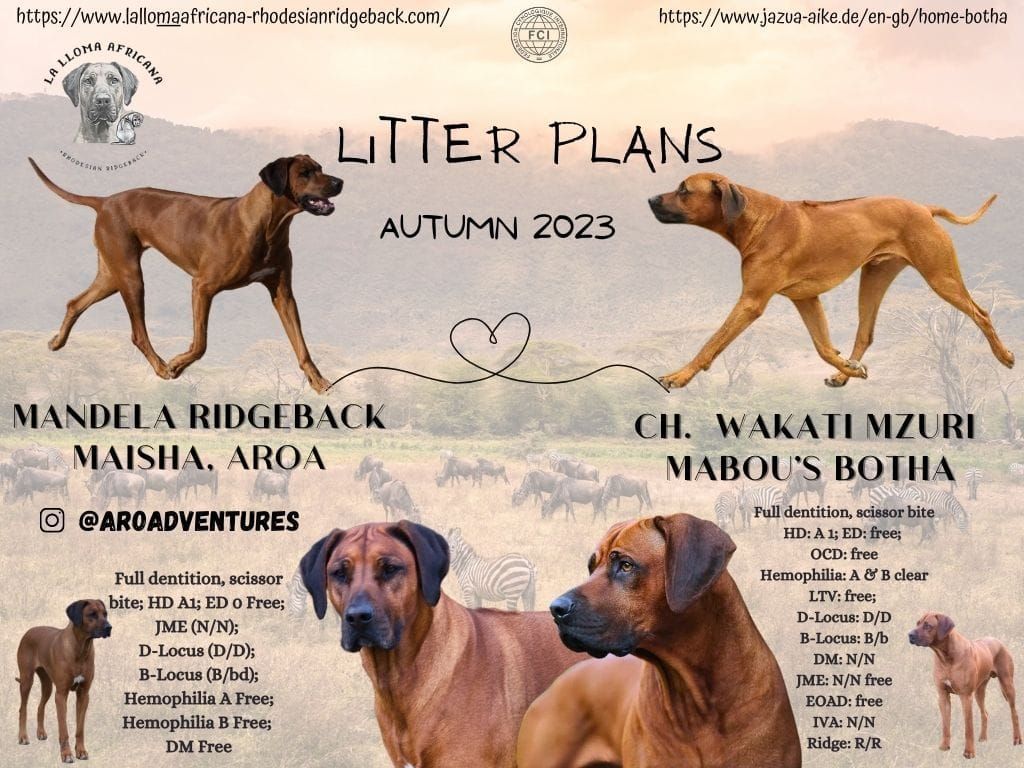 Full of pride and with great pleasure we proudly announce Botha's mating with Aroa "Mandela Ridgeback Maisha" from Spanish kennel "La Lloma Africana" of Jessica Duran Lujan.