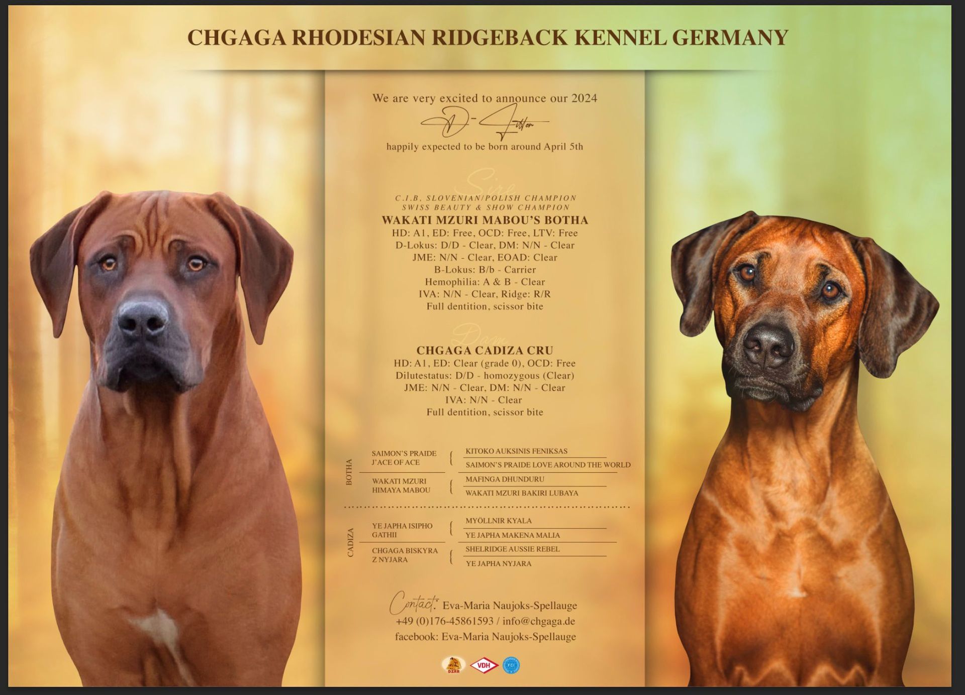 Full of pride and with great pleasure we proudly announce Botha's mating with Cadiza "Chgaga Cadiza" from German kennel "Chgaga" of Eva-Maria Naujoks Spellauge and Gustav Spellauge.