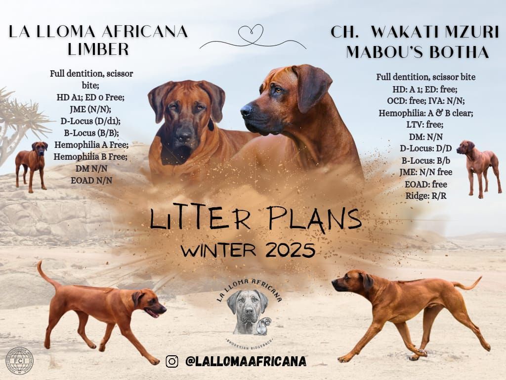 In der Zwischenzeit wurde die Trächtigkeit bestätigt und wir freuen uns sehr, um den 03. September 2025 einen gesunden und zahlreichen Wurf im Kennel La Lloma Africana begrüßen zu dürfen.